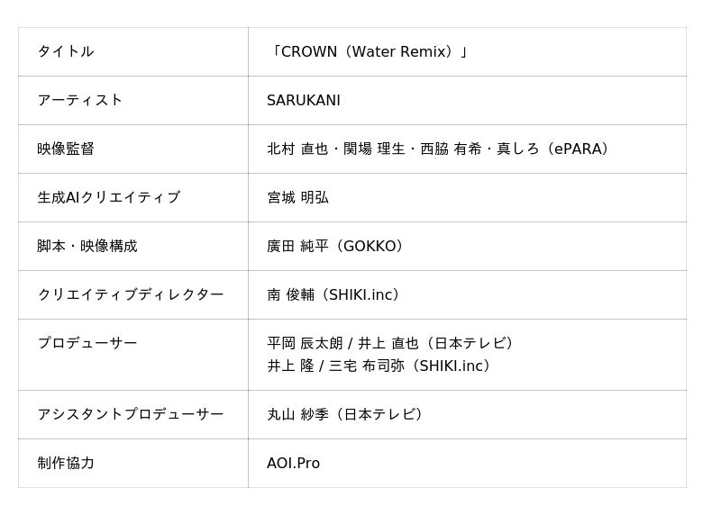 視覚障害をもつ、eスポーツプレイヤー、声優、エンジニア、ピアノ、声楽、演劇など異なる分野で活動する4名が監督を務め、ヒューマンビートボックスクルーSARUKANIの楽曲『CROWN』をアレンジした『CROWN(Water Remix)』を、生成AIを活用して映像化したミュージックビデオ作品です。