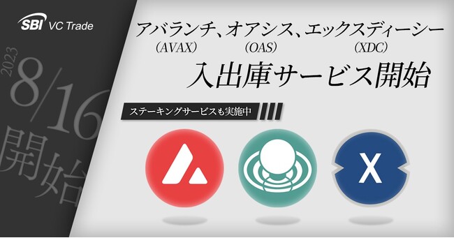 SBI VCトレード株式会社(本社:東京都港区、代表取締役社長:近藤 智彦、以下「当社」)は、2023年8月16日(水)より、アバランチ(AVAX)、オアシス(OAS)、エックスディーシー(XDC)の入出庫サービスを開始したことをお知らせいたします。