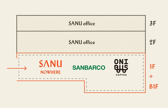 *地下1階地上3階建ての建築のうち、地下1階・1階にタコス、ナチュールワイン、コーヒー、映画、音楽を楽しめる「SANU NOWHERE」が位置します。さらに、2・3階はSANUの本社オフィスとして機能します。