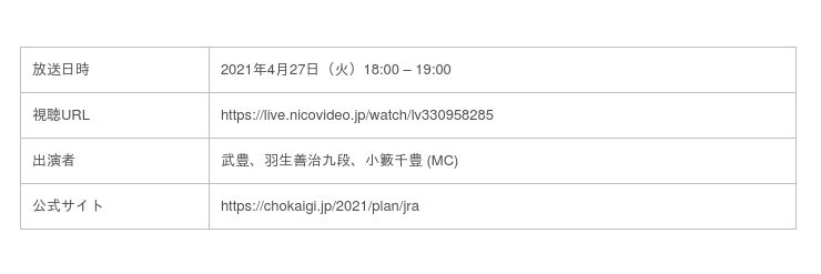 株式会社ドワンゴ(本社:東京都中央区、代表取締役社長:夏野剛)は、インターネットの祭典「ニコニコネット超会議2021」(開催期間:2021年4月24日~5月1日)の「超JRA」企画において、騎手・武豊と棋士・羽生善治九段を迎えた生対談「超レジェンド対談~武豊×羽生善治32年ぶりの邂逅~」を4月27日(火)に実施することをお知らせします。