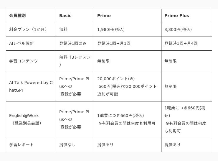 これまでの「AI Speak Tutor 2」は一律3,300円(税込)で全てのコンテンツをユーザーにご利用いただいておりましたが、気軽に始められるようにBasic、Prime、Prime Plusの3段階に変更しました。