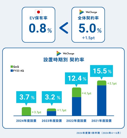 ユビ電株式会社(本社:東京都港区、代表取締役社長:山口 典男、以下ユビ電)は、EV充電サービス「WeCharge」に関する最新の指標をお知らせいたします。国内の乗用車におけるEV保有率が0.8%[1]である中、「WeCharge」を導入している集合住宅などにおける基礎充電インフラの契約率(WeChargeが個別設置された駐車区画のうち、実際にEV充電されている割合)が5.0%に達し、全国のEV保有率の約6倍となっています。この結果は、「マンションのEVコンセントから充電できる」環境が需要を喚起し、EV普及の後押しとなることを示しています。2024年度第1四半期(2024年4~6月)の基礎充電契約率(個別設置型)は、前四半期(2024年1~3月)の3.5%から1.5ポイント増加しました。またWeCharge利用者のうち約3分の1はPHEV(プラグインハイブリッド車)でした。