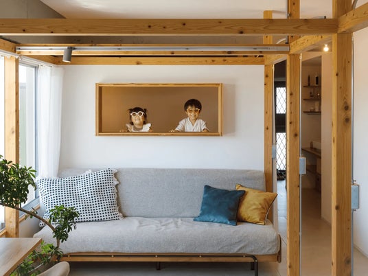 将来予想されるライフステージの移り変わりに備え、柱材で組み上げたフレームで「部屋のアウトライン」を設け、間取りの作り替えを容易にしました。フレームはデザイン上の見せ場にもなっています。その時々で部屋の使い方を考えたり、模様替えを楽しんだりできる自由度が魅力です。