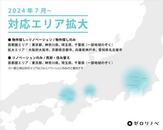 一級建築士、不動産投資家、元銀行員の各専門家のもと「大人を自由にする住まい」をコンセプトに、不動産仲介・リノベーション設計・工事のワンストップリノベーションサービス「ゼロリノベ」を運営する株式会社groove agent(本社:東京都港区、代表取締役:鰭沼悟)は、2024年7月1日よりワンストップリノベーションの対応エリアを大阪府大阪市、京都府京都市、兵庫県神戸市、愛知県名古屋市へ拡大いたします。■対応エリア