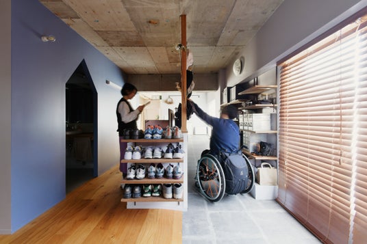 車椅子でも快適に暮らせるよう、スロープや十分な通路幅を確保したバリアフリーな設計。サニタリーに回遊動線をつくることで行き止まりをなくし、生活しやすくしました。木ルーバーの天井や有孔ボードの間仕切りなど、インテリアはラフで温かな雰囲気に。