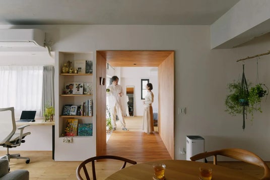飾ることが好きな施主のために内装の素材感を活かしてさまざまな背景をつくりだし、ディスプレーのきっかけをデザインしました。リビングと寝室をつなぐ小空間にチーク材を貼ってトンネルのように仕上げることで、生活シーンを切り取る額縁のような効果を。https://www.zerorenovation.co.jp/works/f461-case90