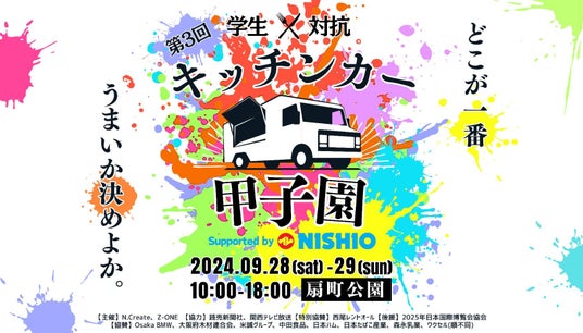 ニシオホールディングス傘下の西尾レントオール株式会社(本社:大阪府大阪市、代表取締役社長:西尾公志)は、2024年9月28日(土)・29日(日)の両日、大阪・天満の扇町公園で開催される『第3回キッチンカー甲子園 Supported by NISHIO』に特別協賛し、参加する現役大学生や専門学生が夢に向かってチャレンジできる場作りに貢献します。