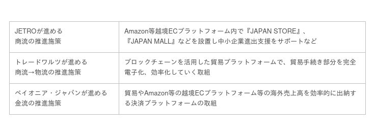 その一つの鍵である貿易や越境ECにおいては、商流(契約を結ぶ)、物流(モノを運ぶ)、金流(支払いを行う)といった3流の効率化と促進が必要不可欠であり、官民で様々な取組が続けられています。