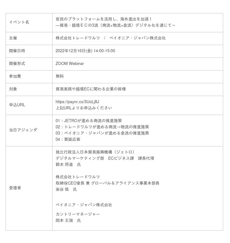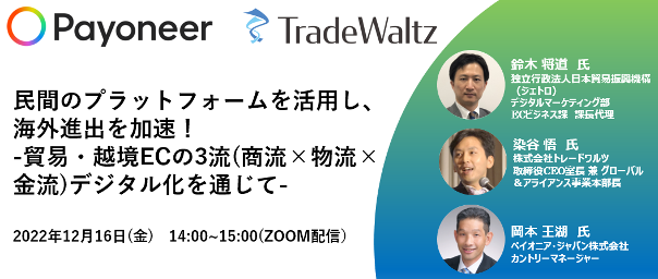 貿易情報の連携プラットフォーム「TradeWaltz(R)」を運営する株式会社トレードワルツ(以下:トレードワルツ)と、デジタルコマースの世界的パートナーであるPayoneer Inc.(本社:米国ニューヨーク)の日本法人、ペイオニア・ジャパン株式会社(以下 Payoneer Inc.とあわせて「ペイオニア・グループ」という。)は、日本企業の貿易、越境ECの3流(商流×物流×金流)デジタル化推進を目的としたセミナーを2022 年12月16 日に開催いたします。