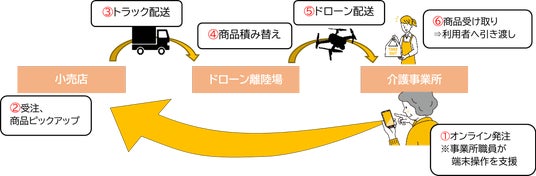 (2) 注文された商品を陸路(自動車)+空路(ドローン)により介護施設へ配送。