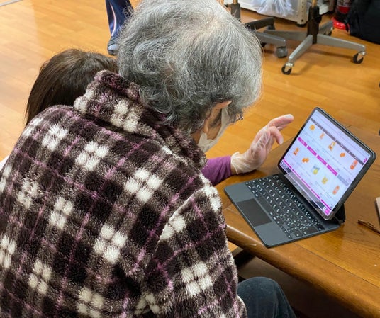 介護サービス利用者が介護施設職員の補助を受けながらオンライン注文している様子
