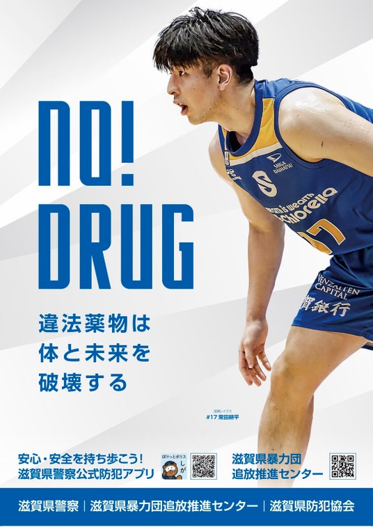 ポスターは「不当要求防止啓発(野本大智選手)」「詐欺被害防止啓発(田原隆徳選手、岡田泰希選手、森山修斗選手)」「薬物乱用防止啓発(常田耕平選手)」の3種類で、今後は滋賀県警察や県内の公共施設、金融機関などに掲出される予定です。