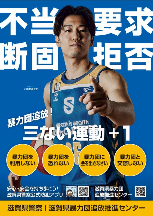 滋賀レイクスは2022年に滋賀県警察と包括連携協定を締結しており、今回のポスターは同協定に基づく取り組みの一環として制作されました。