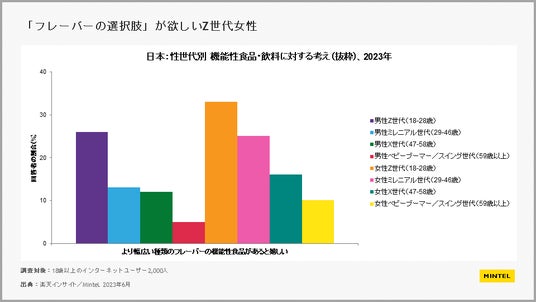 このような素材にこだわった商品が注目を集める中で、味についての選択肢拡大を望む傾向も見えてきました。 機能性食品・飲料について、「より幅広いフレーバーの選択肢が欲しい」という回答の割合を見ると、男女別では女性の方が、より多くのフレーバーを求めていますが、男女それぞれを世代別に見ると男女ともZ世代が最もその傾向が高いことが分かります。全体ではZ世代女性がトップの33%ですが、26%で2位のZ世代男性はミレ二アル世代男性の倍の割合です。Z世代にとって、「美味しさ」や「様々なフレーバー」を楽しめるか、その商品から満足感を得られるかは、彼らが商品購入の際に注目する商品の「パフォーマンス」を測る上で、他世代よりも重要な要素となっていることが示されました。