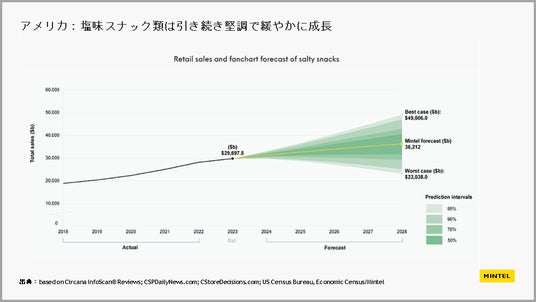 アメリカのソルティ・スナックカテゴリーの売上は堅調で、2023年には前年から推定6%増の297億ドルに達しています。