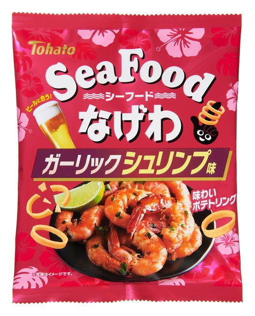 シーフードなげわ・ガーリックシュリンプ味は、ガーリックシュリンプ味のポテトリングスナック。海老の香ばしい風味とガーリックのうまみが食欲をそそる味わいに仕立てているといい、ビールに合う海鮮のおいしさを訴求している。期間限定販売。(2024年7月29日発売、終売済み)