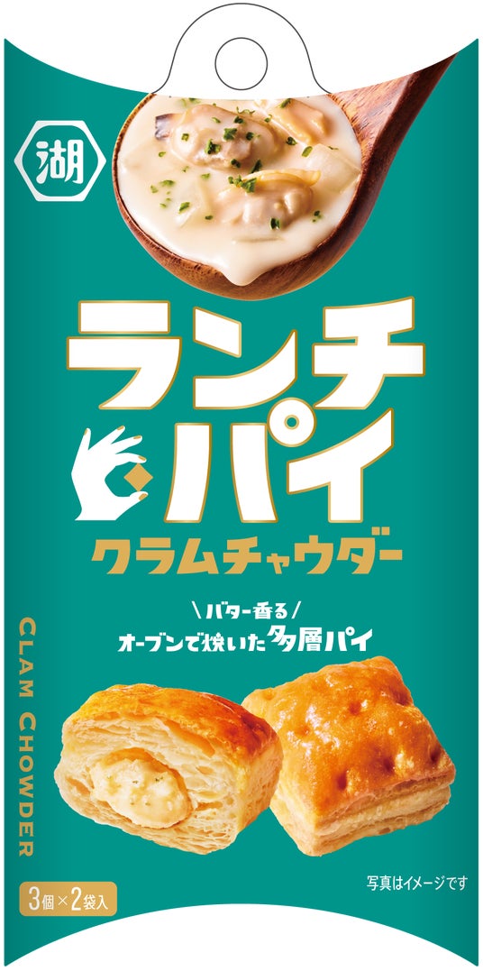 ランチパイ クラムチャウダーは、軽食市場の新たな選択肢として、スナック感覚で手軽に食べられる甘くない製品を開発しました。パイ生地で濃厚な料理のフィリングを包んでいます。(2024年3月25日発売)