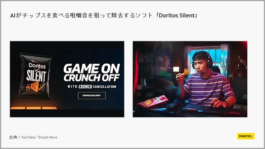 そして、PepsiCoは2023年11月1日、AI搭載の咀嚼(そしゃく)音除去アプリ「Doritos Silent」を発表しました。「Doritos Silent」により、PCゲーム中に他のプレイヤーを邪魔せずにチップスを食べることができます。同AIは5,000種類以上の異なる「パリパリ音」を学習しているといいます。没入型エンタメは、今後も食体験を進化させます。