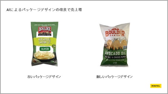 例えば、Boulder CanyonはAIを活用して消費者に響くパッケージデザインを予測しています。緑色にすることでアボカドオイルの使用をイメージさせ、サクサクとした食感の「キャニオン(峡谷)カット」を強調することで、コロラドの自然をも想起させています。 この新しいパッケージデザインに変更したことで、売上高が55%増加したとしています。