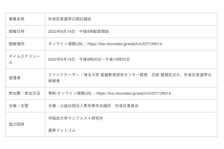 #杉並区長選挙【6月14日(火)21:00~生配信】杉並のトップを決める杉並区長選挙に伴う公開討論会を実施