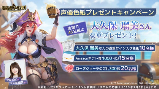 抽選賞品:大久保瑠美さん直筆サイン入り色紙×10名様、Amazonギフトカード1000円分×15名様、ゲーム内アイテム「ローズクォーツの欠片300枚」×20名様