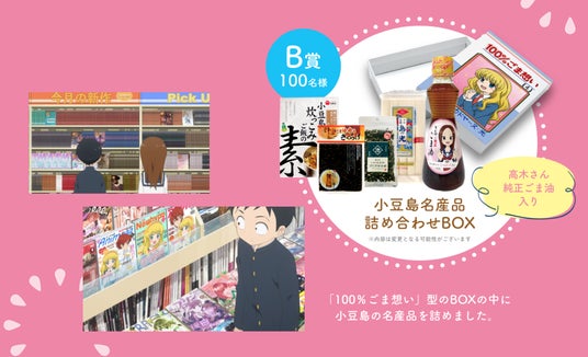 今回は小豆島育ちである、かどや製油と「からかい上手の高木さん」が初めてタイアップし、「からかい上手の高木さん」のオリジナルスピーカーや小豆島の名産品が当たるキャンペーンを実施します。