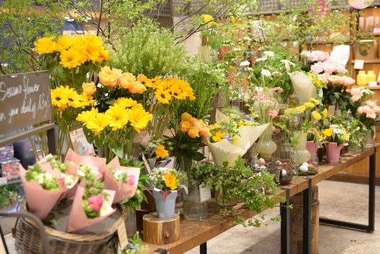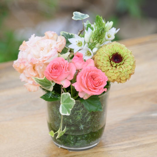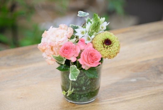 取扱い花材:バラ、ジニア、ヒマワリ、カーネーション、ユリ、アイビー、など