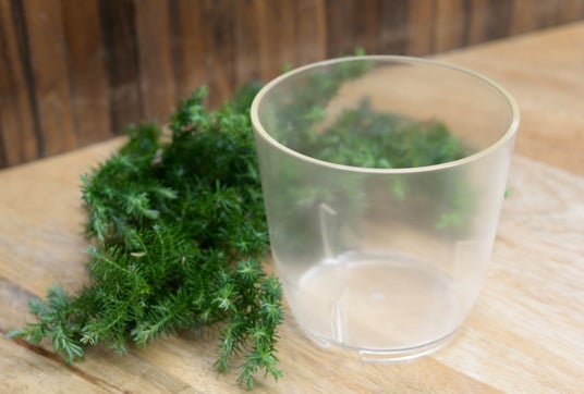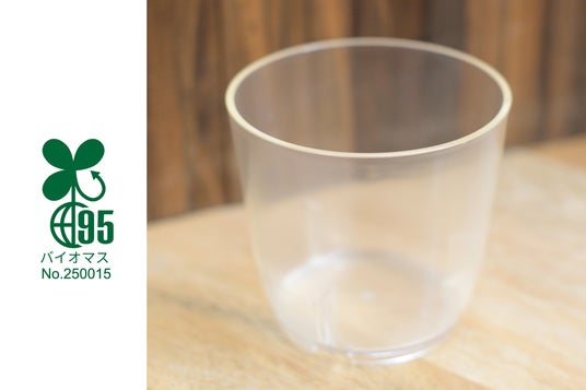 今回、日比谷花壇が掲げる環境負荷低減目標の一つである「プラスチックを、再生品やバイオマスプラスチックに転換していくこと」に基づき、グループ会社の株式会社フレネットHIBIYAとともに、トウモロコシ由来の原材料を95%使用したバイオマスプラスチックの透明な花器を新たに開発しました。