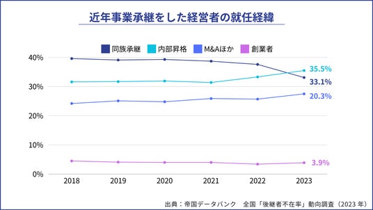 近年事業承継をした経営者の就任経緯の内訳を見ると、2023年は血縁関係によらない役員・社員を登用した「内部昇格(従業員承継など)」が 35.5%で1位、「同族承継(親族内承継など)」が33.1%で2位となっています(※2)。