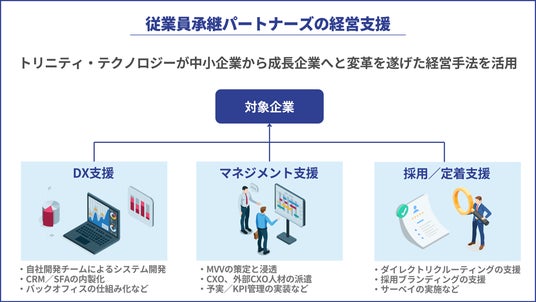 支援中はトリニティ・テクノロジーが成長企業としてこれまで培ってきたノウハウを活かし、DX・マネジメント・採用などにおいて強力に対象会社を支援します。