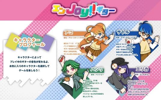 - キャラクターによってプレイ中のギターの音色が変わり、お気に入りのキャラクターを選択してゲームをお楽しみ頂けます。