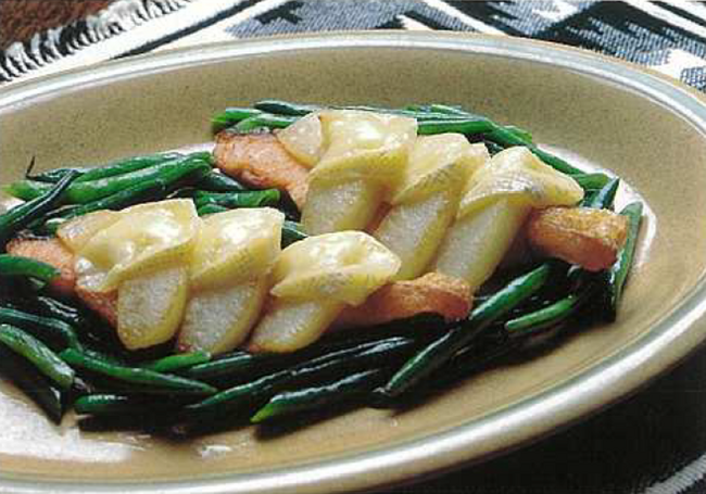 とろみが出てきたら3.の野菜と4.の魚、梨を加え、一煮して皿に盛る。