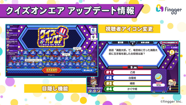 株式会社fingger(本社:東京都品川区、代表取締役:吉江直人)は、2022年6月1日(水)に、次世代ゲーム配信プラットフォーム fingger(フィンガー)のコンテンツ『クイズオンエア』のアップデートを実施いたしました。