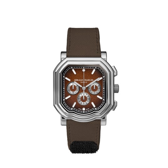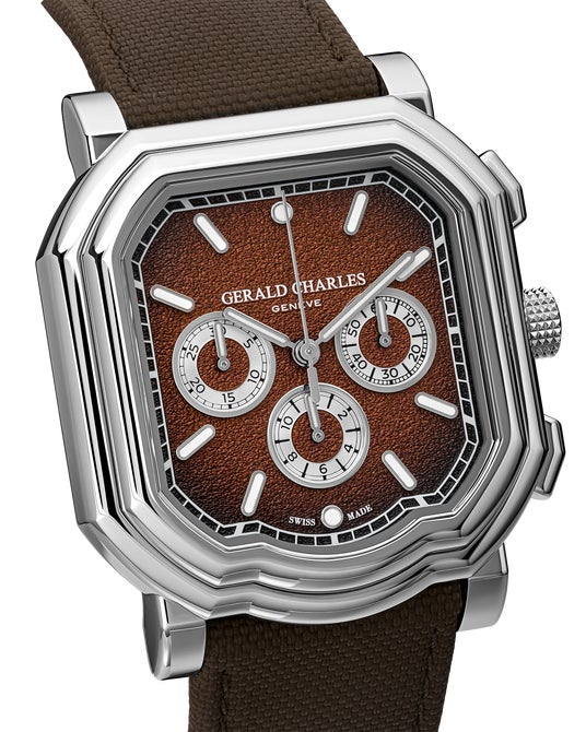 マエストロ 3.0 クロノグラフの心臓部には、スイスマニュファクチュール 3.0キャリバーが搭載され、卓越した精度を発揮するとともに、ジェラルドチャールズの優れたクラフツマンシップへのこだわりを示しています。特徴的なマエストロケースはクロノグラフのレイアウトに完璧に適しており、6時位置に配置された三つのカウンターを自然に収めます。さらに、本モデルはピラミッド型プッシャーを備え、ケースに美しく調和するよう丁寧に成形されており、美観と着用者の快適性の双方を高めています。