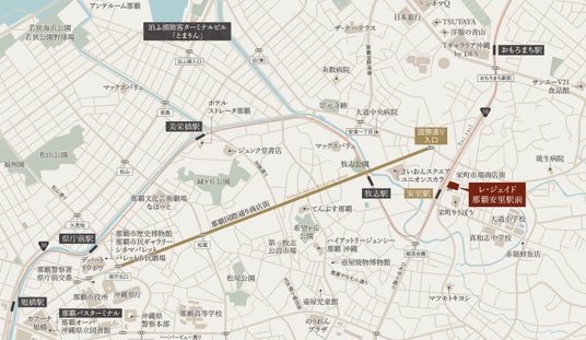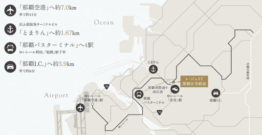 当物件は、ゆいレール「安里」駅まで徒歩2分の場所に位置し、「那覇空港」駅へのダイレクトアクセスや、那覇新都心エリア、官公署・ビジネスエリア、那覇バスターミナルへのスムーズな移動が可能な交通利便性の高い立地です。さらに、離島への玄関口である泊ふ頭旅客ターミナルビル「とまりん」まで約1.67km、沖縄自動車道「那覇IC」まで約3.9kmと近く、沖縄でのリゾートライフの拠点に適したポジションです。