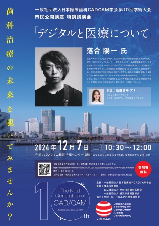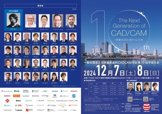 株式会社オール・デンタル・ジャパン(ADJ)が運営事務局を務める、一般社団法人日本臨床歯科CADCAM学会は、2024年12月7日(土)/8日(日)に「第10回記念学術大会」を開催いたします。この度、神奈川県歯科医師会・横浜市歯科医師会の後援を得ることが決定いたしました。