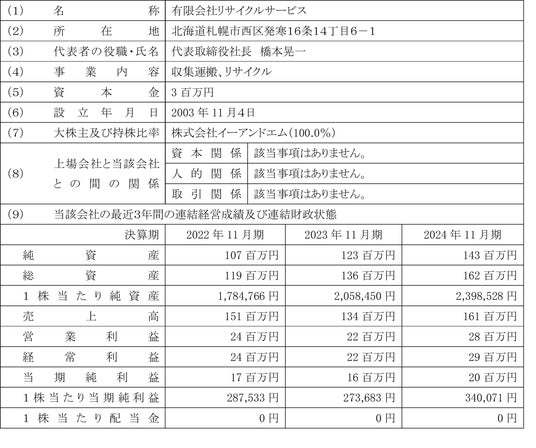 また、イーアンドエムの取引先は近隣自治体や飲料メーカー等多岐に及んでおり、当社グループが推進する公民連携、動静脈企業間連携において、地域のニーズを踏まえ、地元同業者も含めた地域企業との円満な関係を構築しつつ、お取引先様への提案力強化にも資すると考えます。