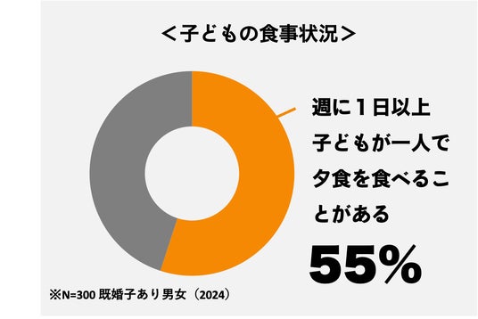 今回のWebCM公開にあたって、2024年9月13日(金)~9月23日(月)に、20~50代の既婚子あり男女 300名を対象とした「家族の食事時間に関する調査」を実施しました。調査結果から、一週間のうち夕食に家族が揃わない日数が「平均3.3日」(※1)と、多くのご家庭において夕食時に家族が揃わないことが日常化していることがわかりました。また、週に1日以上子どもが一人で夕食を食べることがあると答えた人の割合が55% (※2)と半数を超え、その理由としては、「塾・習い事・部活等で子どもの帰りが遅いから」と回答した人が3割。年齢問わず、現代の子どもたちは多忙な日々を送っているようです。