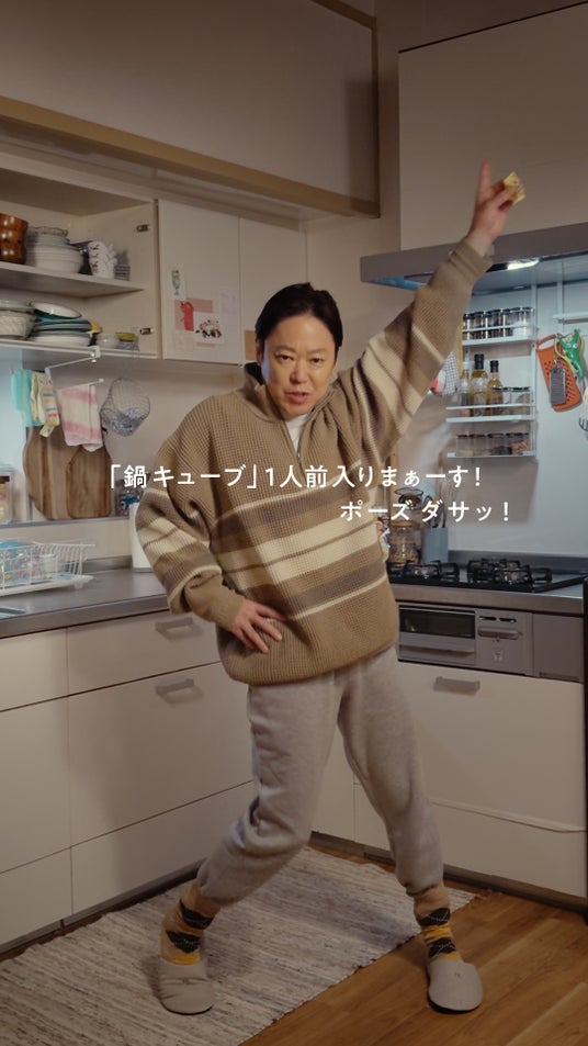 阿部さんが四人家族の父親役を演じる今回のWebCM。映像では、息子が部活や塾で忙しかったり、お母さんが仕事で帰りが遅くなったりと、家族の食事時間が揃わず“家族一緒に食べるのむずかしい説” を、スマホで撮影したホームビデオのような世界観で表現しています。第1夜では、帰宅が遅くなった息子に対して、先に食事を終えた阿部さんが「学校行って、野球やって塾行ってこれから鍋も食べて、俺より忙しいんじゃないの?」と熱くお出迎え。冷蔵庫に用意しておいた一人前の鍋の具材に「鍋キューブ(R)」を投入すると、温かい鍋がすぐにでき上がり。おいしそうに鍋を食べる息子の隣で、阿部さんがうれしそうに寄り添う、ほほえましい家族の光景が描かれています。