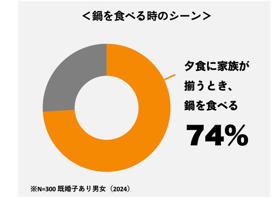 夕食に家族が揃わないことがあると回答した人に、どのような悩みがあるか聞いたところ、「(家族が揃わない日は)大皿料理・鍋料理を作れない」、「焼肉や鍋料理がしにくい」など、<鍋>に関する回答が見られました。実際に鍋を食べるシーンについて聞くと、家族が揃った時に鍋を食べることがある人が全体の74%という結果に。さらに、鍋に関するイメージとして、大きい鍋を家族で囲んで食べるものと回答した人が55%と、鍋=家族揃って・大人数で食べるものというイメージが定着していることがわかりました。