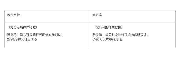 今回の株式分割に伴い、会社法第184条第2項の規定に基づき、2023年6月1日をもって、当社の定款第5条の発行可能株式総数を変更いたします。