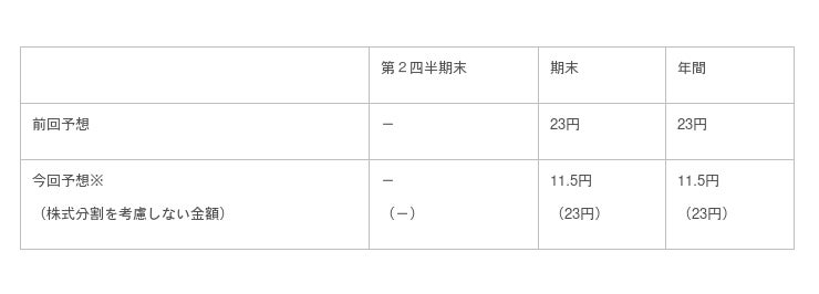 今回の株式分割に伴い、1株当たり配当予想を以下のとおり修正いたします。なお、配当予想に実質的な変更はありません。