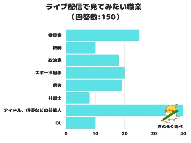 ライブ配信で見てみたい職業をアンケートにて調査したところ、1位は「アイドル、俳優などの芸能人」でした。