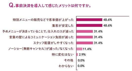 「旅マエ予約」による来店頻度が1ヶ月に1回より多い飲食店の内、事前決済を導入している店舗は32.7%という結果に。導入のメリットを聞いたところ、一般的に言われる「ノーショー(無断キャンセル)の防止」以上に、「特別メニューの販売などによる客単価の向上」(48.6%)と「集客の安定」(48.6%)が同率でトップとなりました。事前に購入できることで、高単価であっても特別なメニューが選ばれやすくなり、客単価の向上につながっていることが推測されます。
