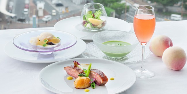 「シャラン鴨のスパイスロティ 桃のソースと共に」などオードヴルからデザートまで、全ての料理で旬の桃が楽しめるランチコース。