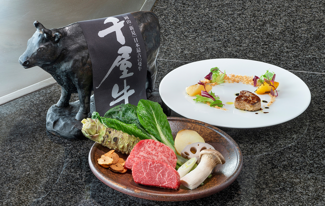 岡山の銘柄牛「千屋牛」のフィレ・ロースの食べ比べをメインに、県産食材を使用した前菜と共にお楽しみいただけるコース料理。
