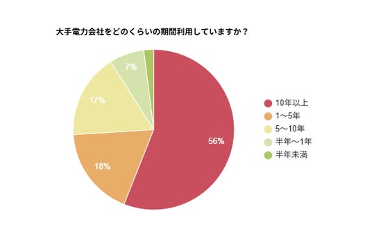 大手電力会社を利用している期間で最も多かった回答は「10年以上」で56%、次点で「1~5年」が18%という結果になりました。