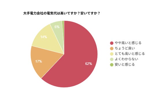 大手電力会社の電気料金に対する調査で最も多かったのは「やや高いと感じる」で62%、「とても高いと感じる」が14%で、大手電力会社の電気料金を高く感じている方が全体の約8割に及びました。
