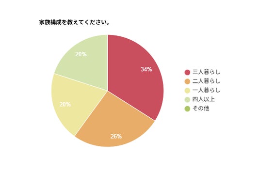 大手電力会社を利用している方の家族構成で最も多かったのは「三人暮らし」で34%、次点で「二人暮らし」が26%と6割を占めました。