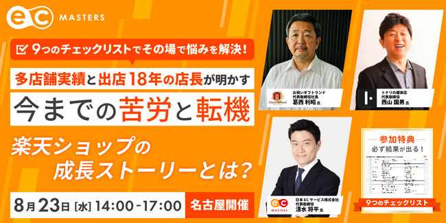 日本ECサービス株式会社(本社:東京都渋谷区、代表取締役:清水将平)は、株式会社ギフトセンターかさい(お祝いギフトランド) 代表取締役 葛西利昭氏、有限会社エコスタイル(トナリの雑貨店) 代表取締役 西山国男氏をお招きして、楽天ショップの公開コンサルティングを2023年8月23日(水)に名駅モリシタ名古屋駅東口店にて開催します。